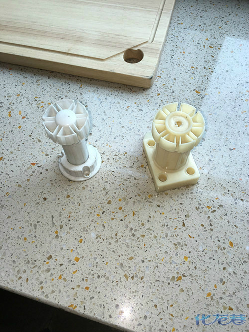四、橱柜柜脚的承重也是很重要的。柜脚太细,承重不够容易导致柜体整个下沉。结果就是台面部分凌空,没有柜体支撑的部分和有柜体支撑的部分会产生断层开裂!选择橱柜的时候好问清楚商家用的是什么样的柜脚,这一点不容忽视哦!
