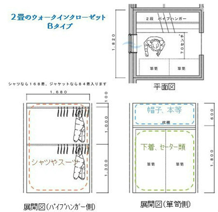 同样的空间,也可采用一边挂衣物一边设置多屉柜(图中箪笥的部分)的分类方式。