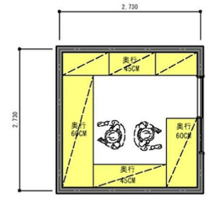 这是一个标准的3平米衣帽间。存放衣物的柜子宽度为600mm,采用中间走道两边衣橱的布局,可以简单计算得到室内有效的小宽度大约需要1.8米。在这里600mm的走道仅能容纳人站立走动,想要在里面换衣服神马的基本是不可行的。