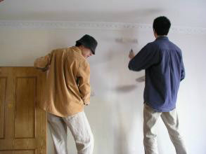 在地板安装的第二天,家里收拾干净了,就可以约壁纸铺贴了。顺利的话,同样是一天的时间。有条件的话,铺贴壁纸的当天,地板应该做一下保护;没条件也没关系,把清理地板上遗留的壁纸胶交给拓荒保洁也没问题。铺贴壁纸之前,墙面上要尽量做到“什么都不要有”。