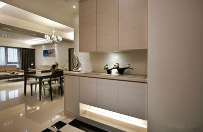 随着人们生活方式的变化,敞开式的厨房设计日益受到年轻人的追捧。敞开式的厨房与餐厅之间大多采用玻璃进行隔断,这样在使用上既保证了厨房与餐厅两个不同区域的相对独立性,彻底杜绝厨房的油烟外泻,又不影响视线及空间感的延伸,并且具有较强的装饰性,能反射一些灯光,折射一些倒影,给人一种极强的通透感和视觉效果。有时为归置餐厅一些零零碎碎的物品与装饰品,还可以将玻璃隔断在餐厅处设计成一个简单的装饰柜,上面放上精致的小摆设,将餐厅与厨房之间单调的隔断变得生动而雅致。