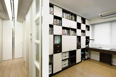 在中小户型有限的使用面积内,书房往往与其他功能空间相融,或在客厅,或在卧室,隔断形式也常采用帷帘、到顶的书架、绿化植物等隔断形式。如果希望空间有完全的封闭性和私密性,不受外界的打扰,可以选择不透明的落地壁柜作为隔断,如此不仅可以隔出完全封闭的空间,还可以实现一定的收纳功能。
