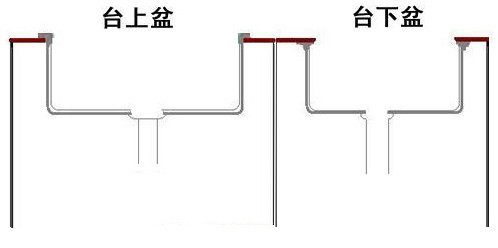 台上盆搭在台面上,台下盆粘在台面下。