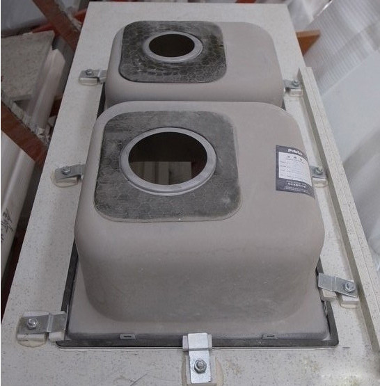 第二、水盆和台面间的台面胶处理工艺(由液体涂抹,它会冷却固化后,起粘结和定位作用,粘牢后用手掰都掰不下来)。