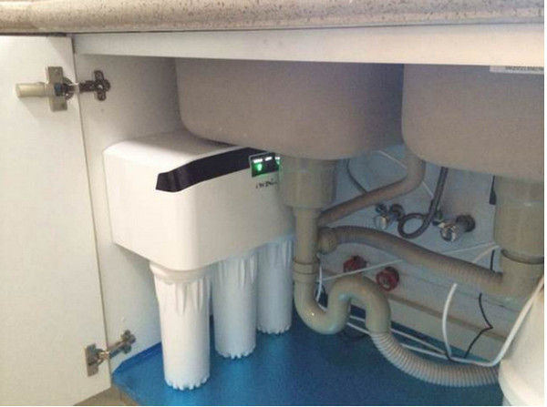 柜子里的空间本来不大,2~3厘米的重要性就显现出来了,根据不同家庭对橱柜要求的不同,柜子里面空间的高度在62~72厘米之间。所以一旦定下来做台下盆之后,还要想好做不做净水器,做的话用什么样子的。如果用下图这样的净水器就可以不用考虑高度的问题。
