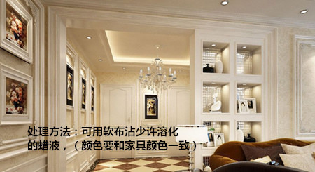 处理方法:如果家具不小心被刮伤,但未触及漆膜以下的木质,可用软布沾少许溶化的蜡液(颜色要和家具颜色一致),涂在漆膜伤处,覆盖伤痕。待蜡质变硬后,再涂一次,如此反复多涂几次,即可将其膜伤痕掩盖。