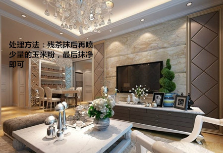 处理方法:残茶是极好的清洁剂,抹后再喷少量的玉米粉进行抹试,后将玉米粉抹净即可。玉米粉能吸收所有吸附在家具表面的脏物,使漆面光滑明亮。
