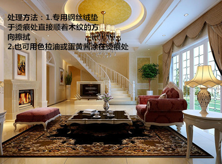 处理方法:用一块干燥的、超细的家具涂装专用钢丝绒垫于烫痕处直接顺着木纹的方向擦拭,也可用色拉油或蛋黄酱涂在烫痕处,取软布顺木纹轻轻擦拭,然后再换一块清洁的软布将其擦干净,后上光。烟头或未熄灭的火柴在家具漆面留下焦痕,若是漆面烧灼,可在火柴杆或牙签上包一层细纹硬布,轻轻擦抹痕迹,然后涂上一层薄蜡,焦痕即可淡化。