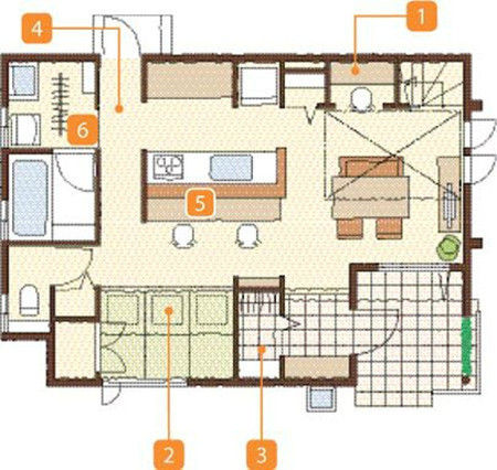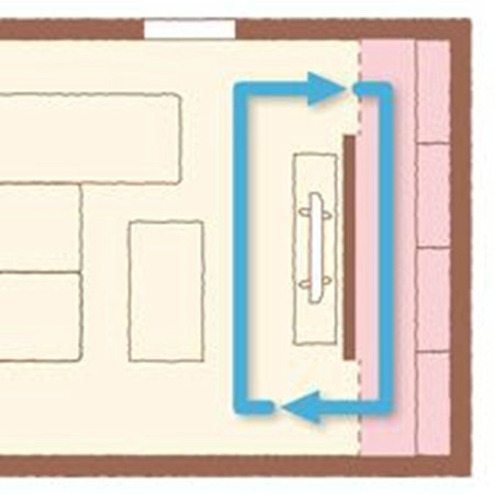 这个布置适合大玄关。对于较小的玄关,有如下方式缩减流线距离,使布局更紧凑。