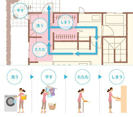 设计的时候就充分考虑从洗衣到晾晒空间到折叠到收纳的流线,例如图中的布局,洗衣房连着阳台,洗完可以直接拿出去晒,收回来叠好直接放进服装的储藏室。