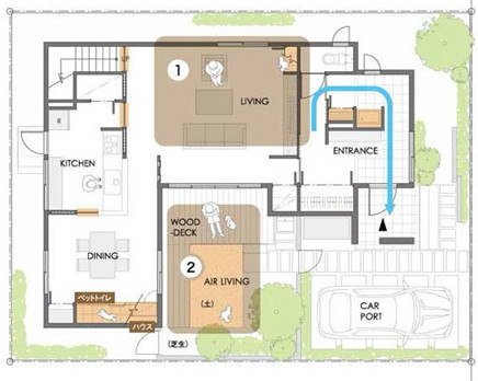 比如图中这样,在客厅附近给狗活动的角落,在卧室附近布置狗的窝。让小狗能够时刻感受到主人又能够保持一定的距离,是非常贴心的。