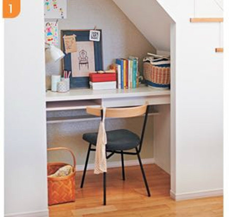 一般的想法,楼梯下基本是作为仓库来使用。但是在这个户型中,恰好楼梯侧面对着客厅,在这个小空间里布置桌子能够让人在融入客厅活动的同时又保持自己空间的私密感,能够让妈妈做一些简单的手工作业或是作为孩子的作业台。