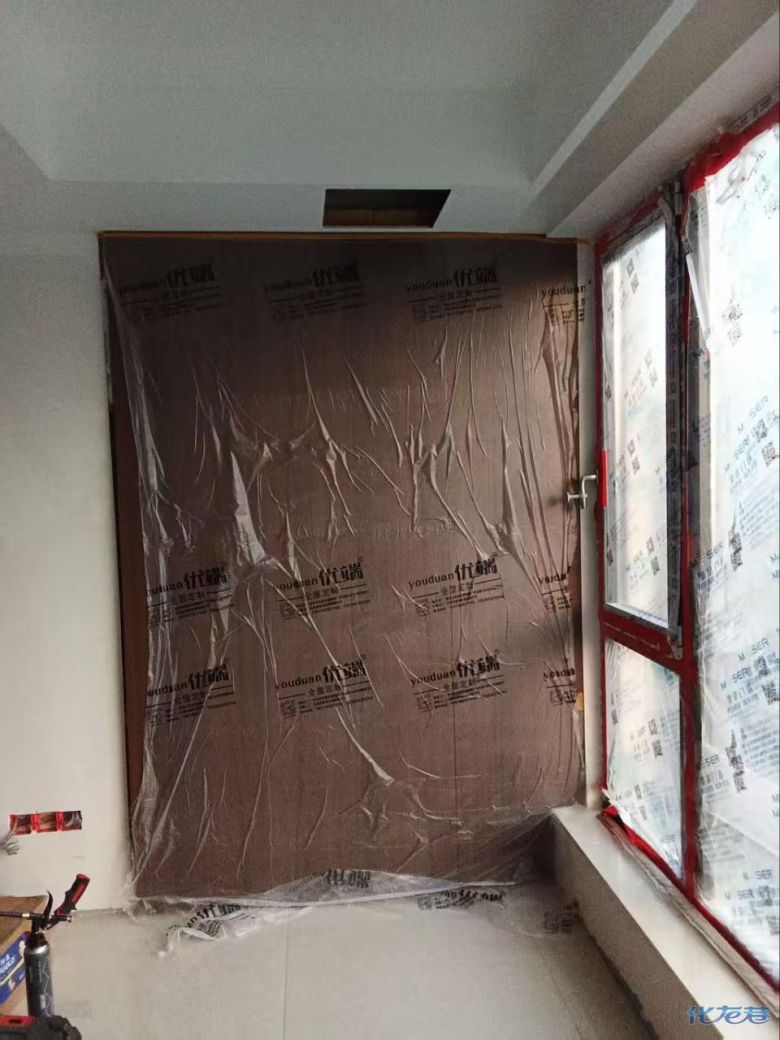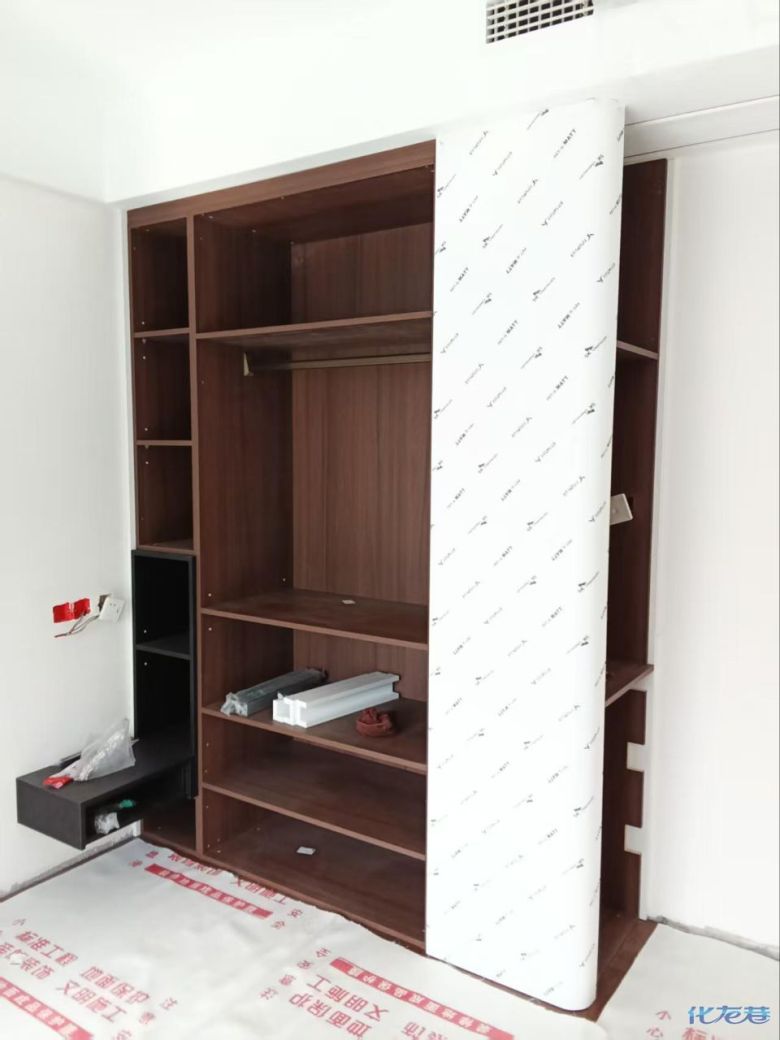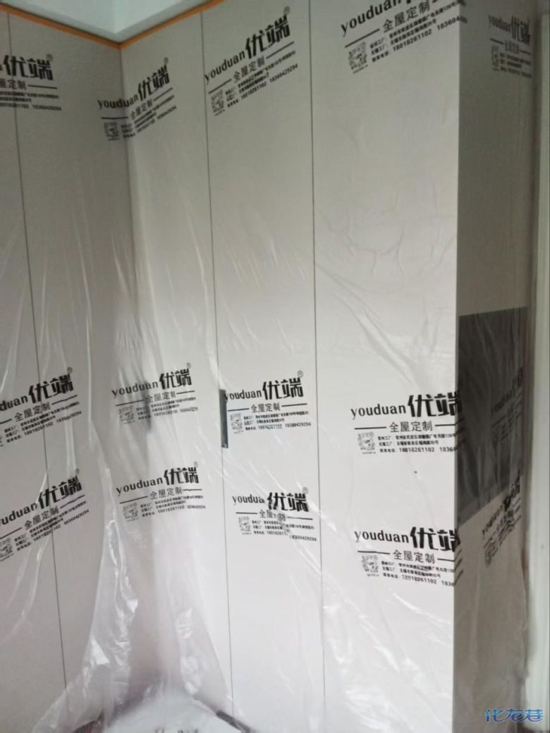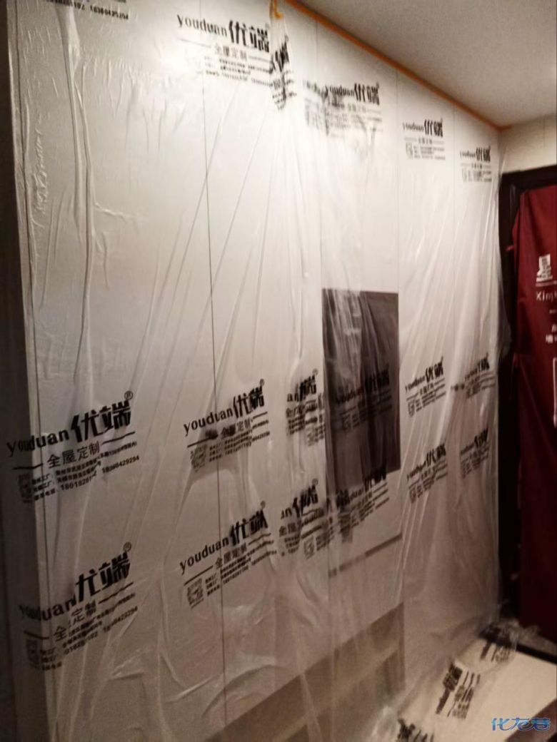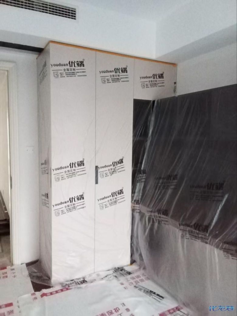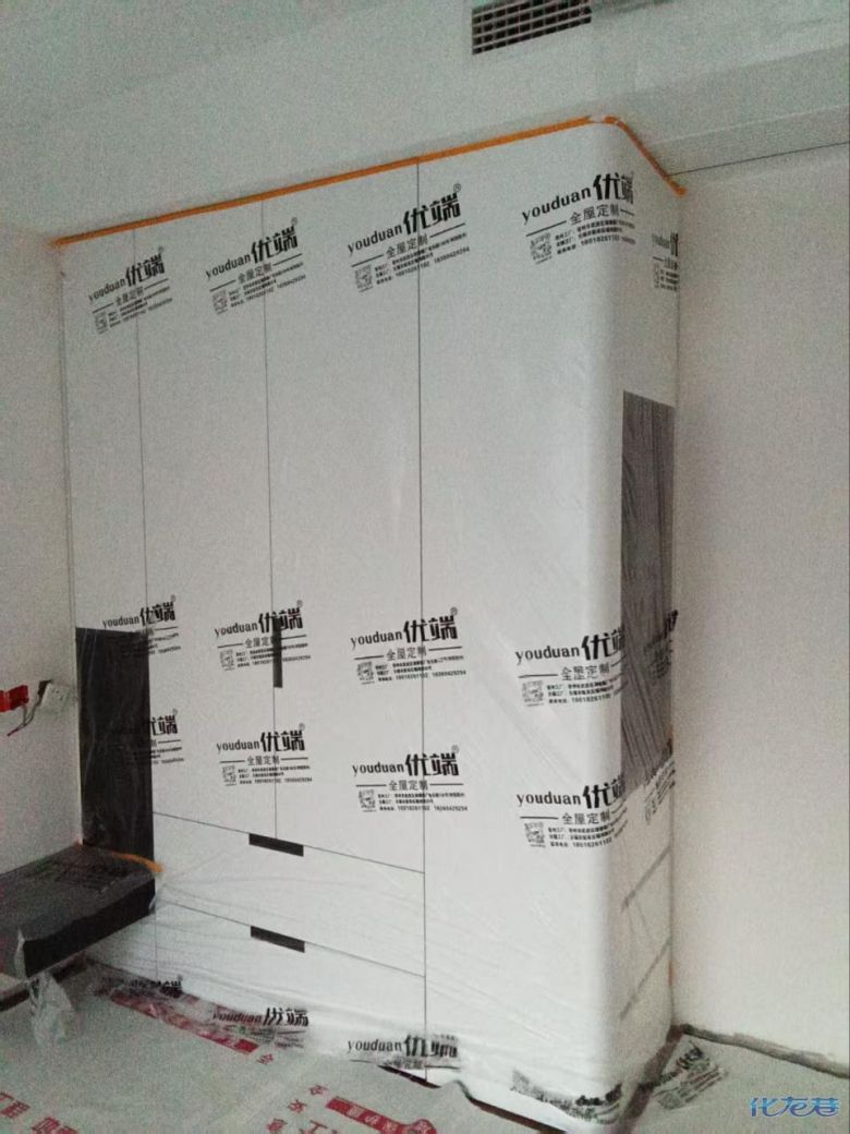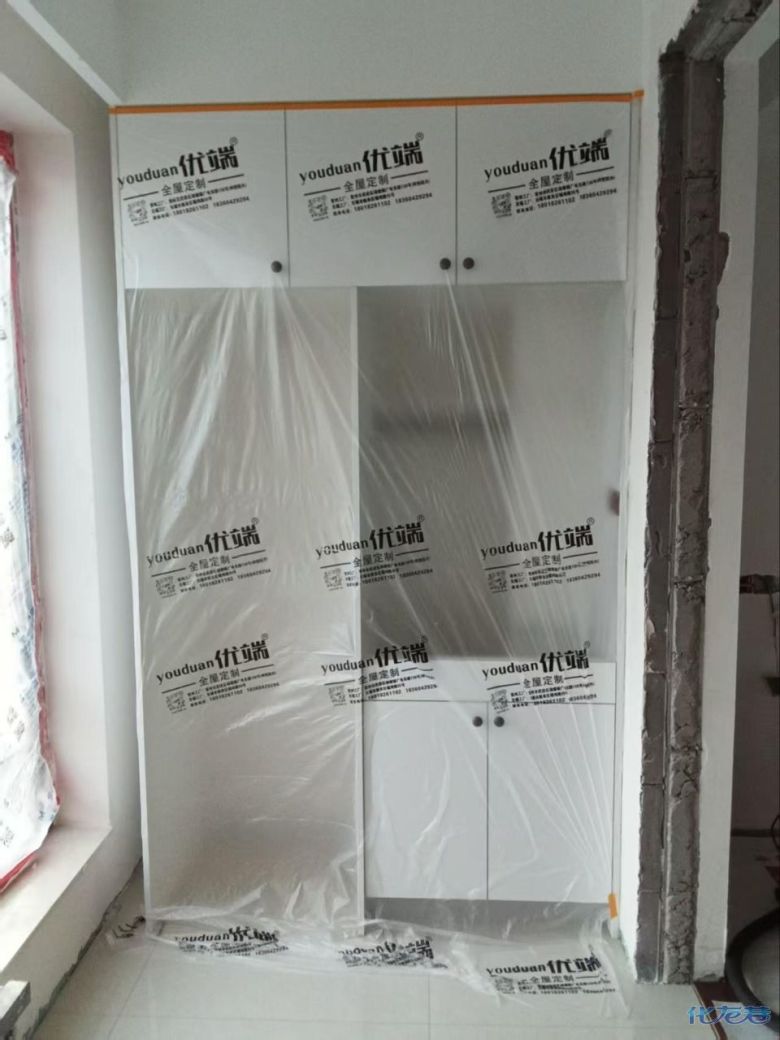 安装完成的柜子都用塑料膜保护起来了