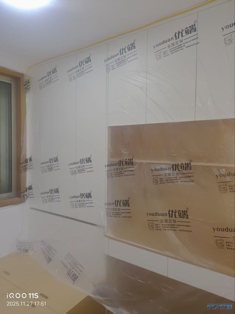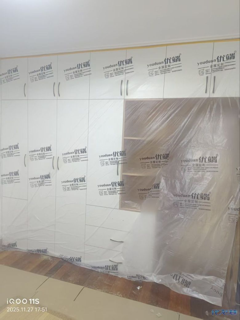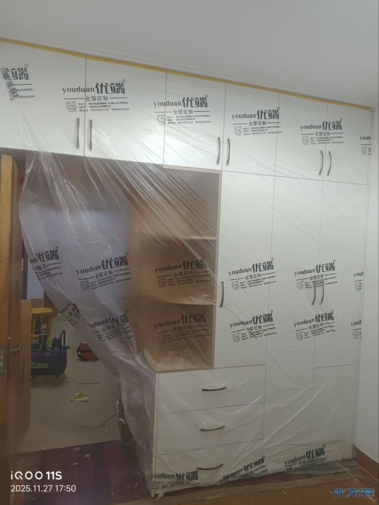 安装完成的柜子都用塑料膜保护起来了