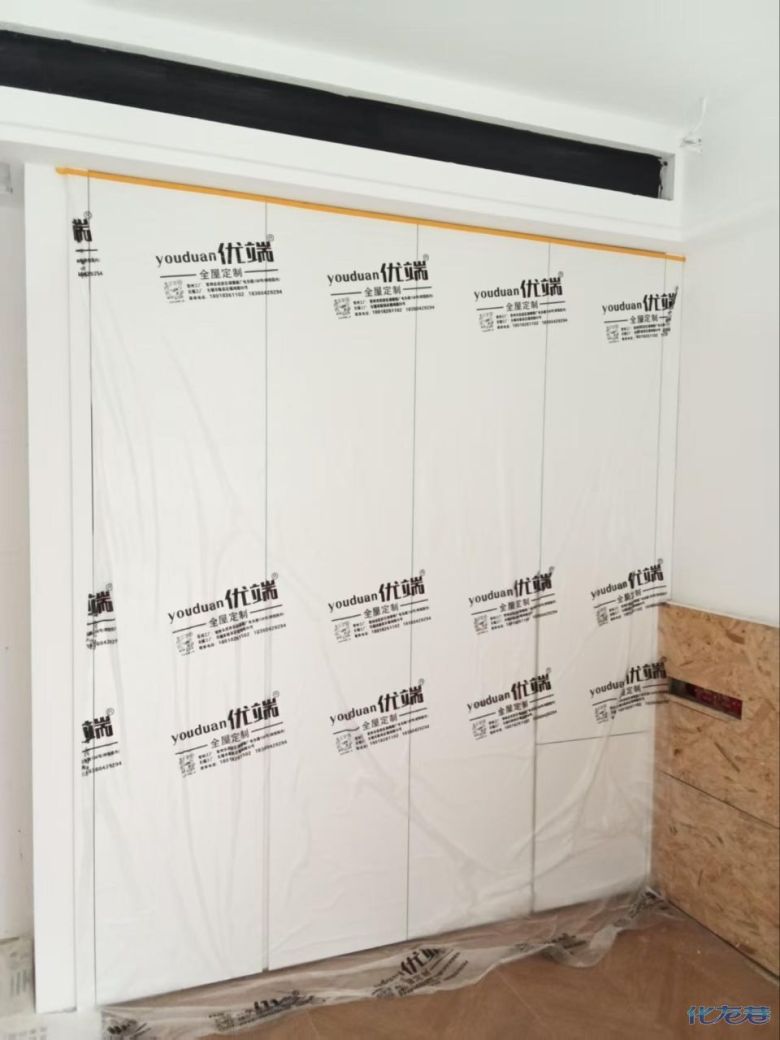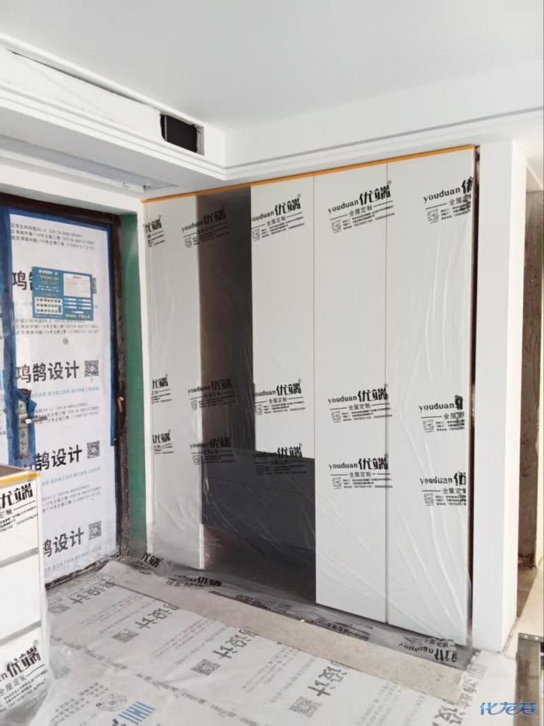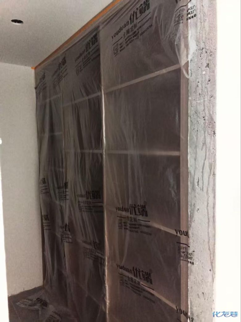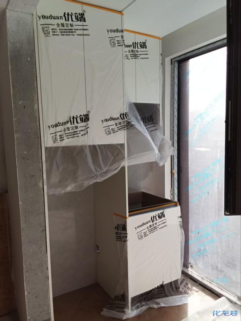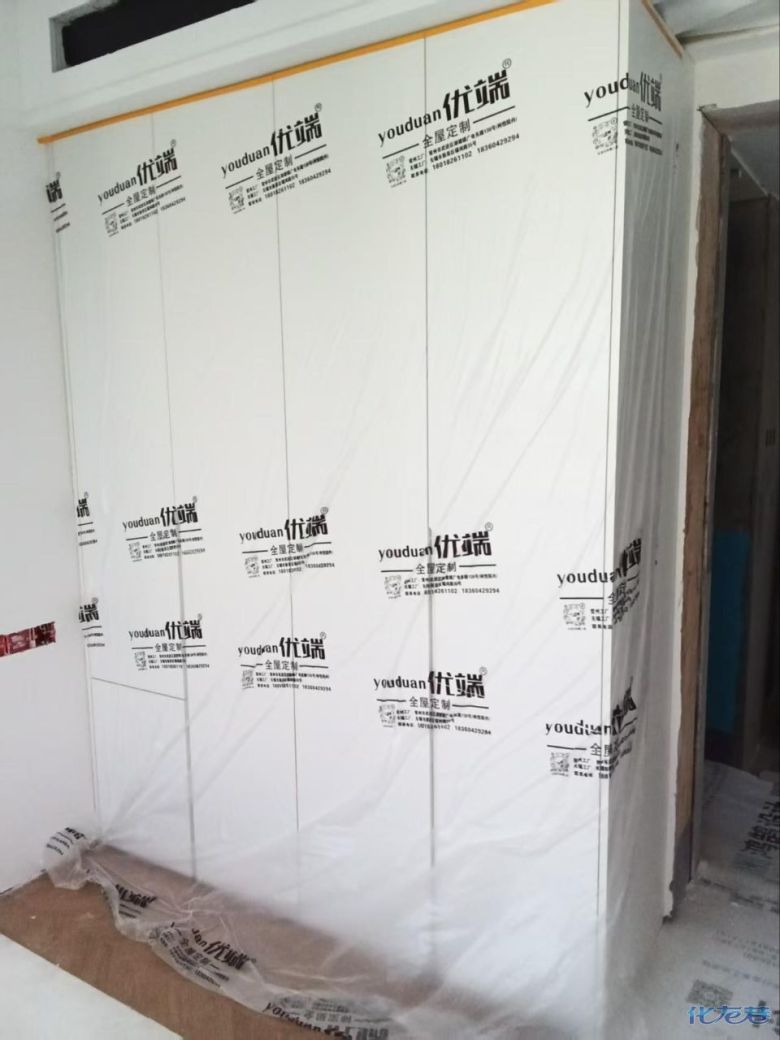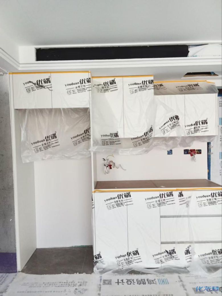安装完成的柜子都用塑料膜保护起来了