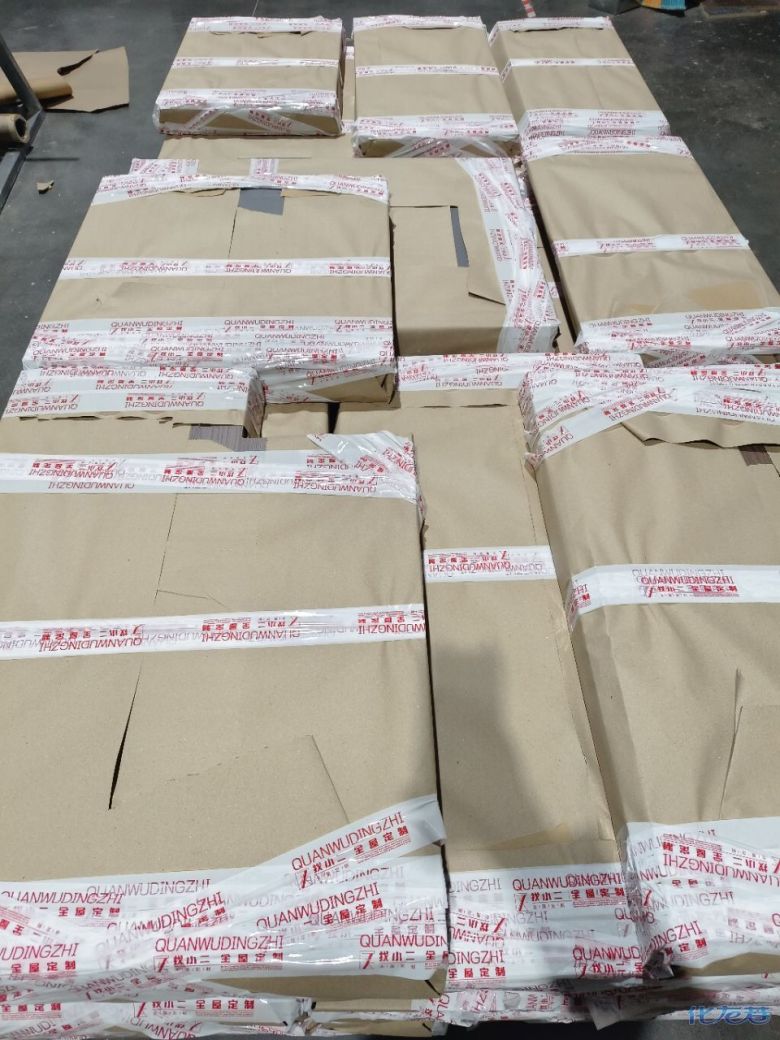 进入打包环节,我家柜子每块板都是整个打包起来的,以防运输过程中划伤或者磕碰到,跟板材下面垫板一个原理哦!重新订板会存在色差,这是重点,圈起来必考。全部打包好就可以联系客户送货咯!