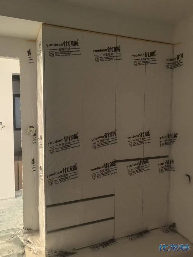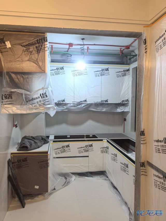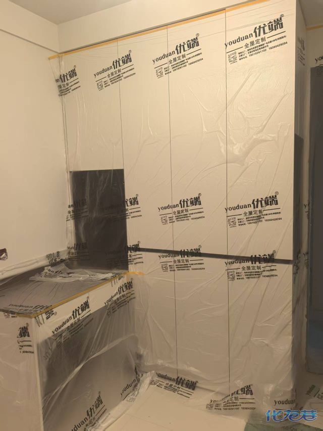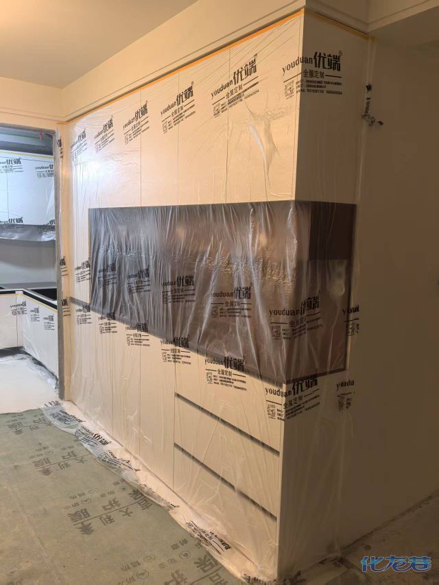 安装完成的柜子都用塑料膜保护起来了