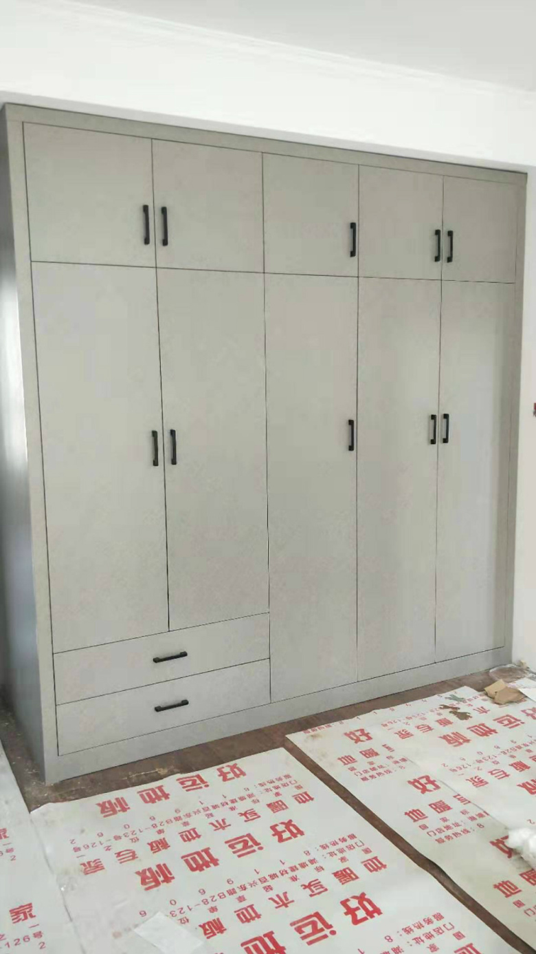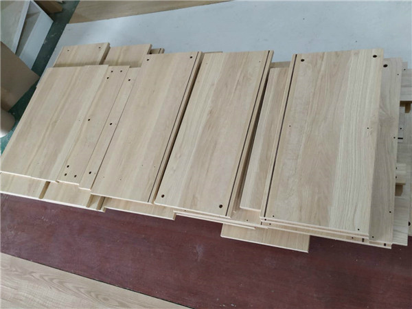 待封边的柜体板材,大概今天下午就能封边了,正在打孔的是主卧衣柜的板材,打孔使用专门的机器打孔,打出来的孔圆润不爆边,图6是柜子的门板板材,打的大圆孔是用来装铰链的,板材使用平安树金沙榆色实木多层板制作,图9是昨天做的橱柜板材,用的是平安树清水橡木色实木多层板,已经做好啦。